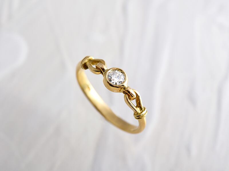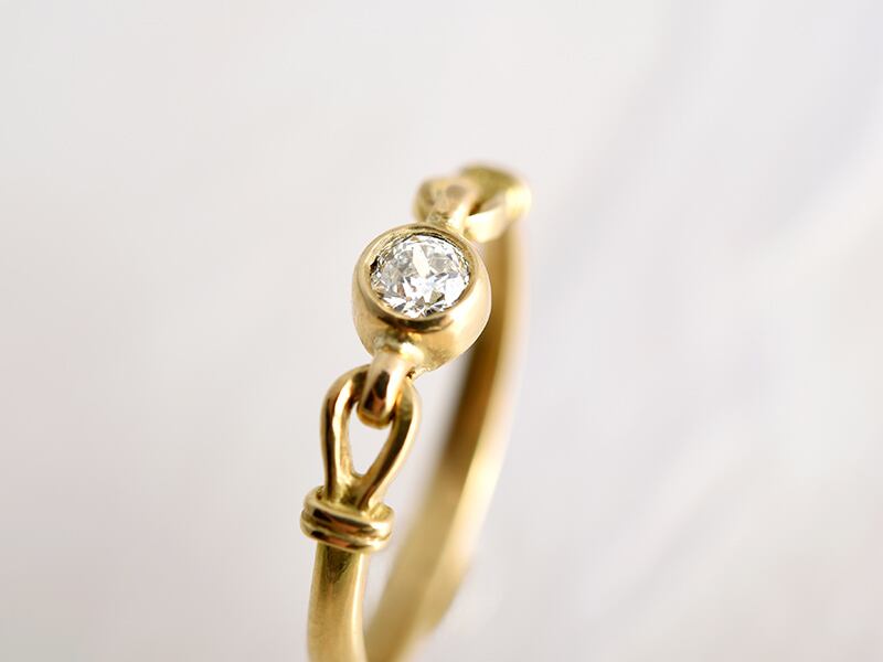 リングの結び目が両サイドから石座部分を引っ張る作りになっており、
