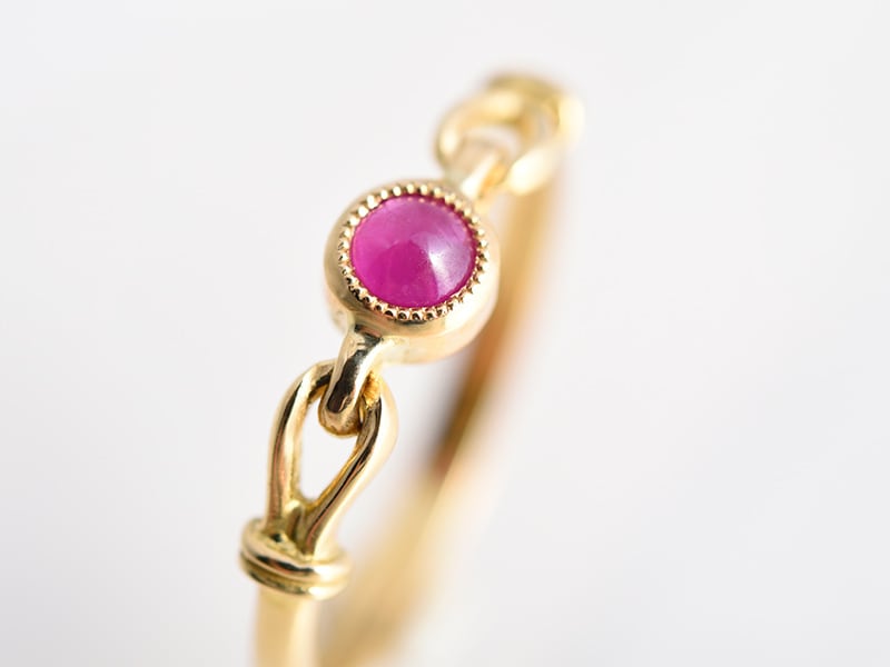 リングの結び目が両サイドから石座部分を引っ張る作りになっており、