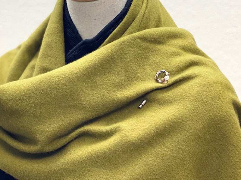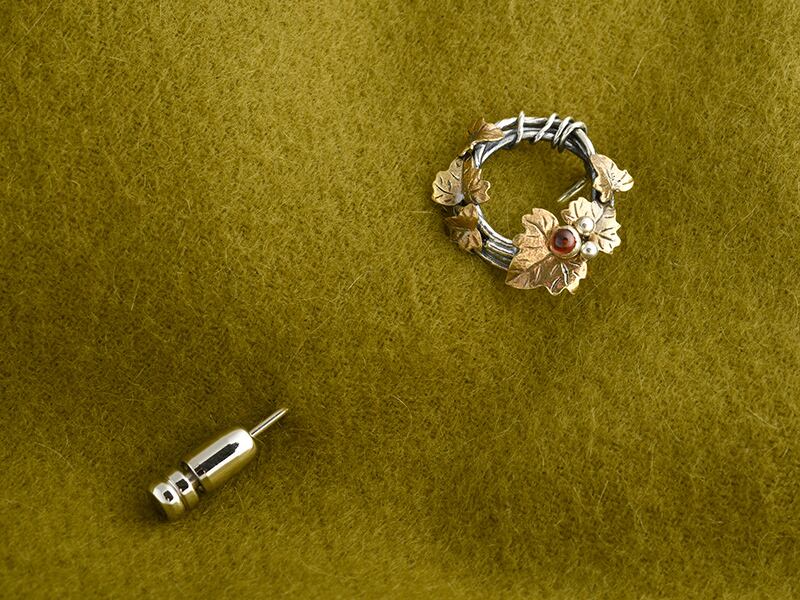 シルバーの本体と、黄銅の葉っぱの黄色のコントラストが素敵な作品です。