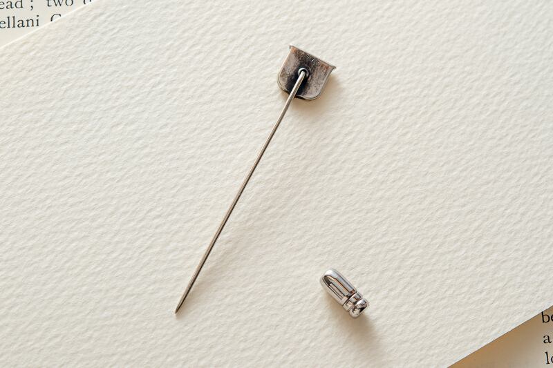 盾の中に3羽の鶏が彫られた紋章をハットピンにしました
