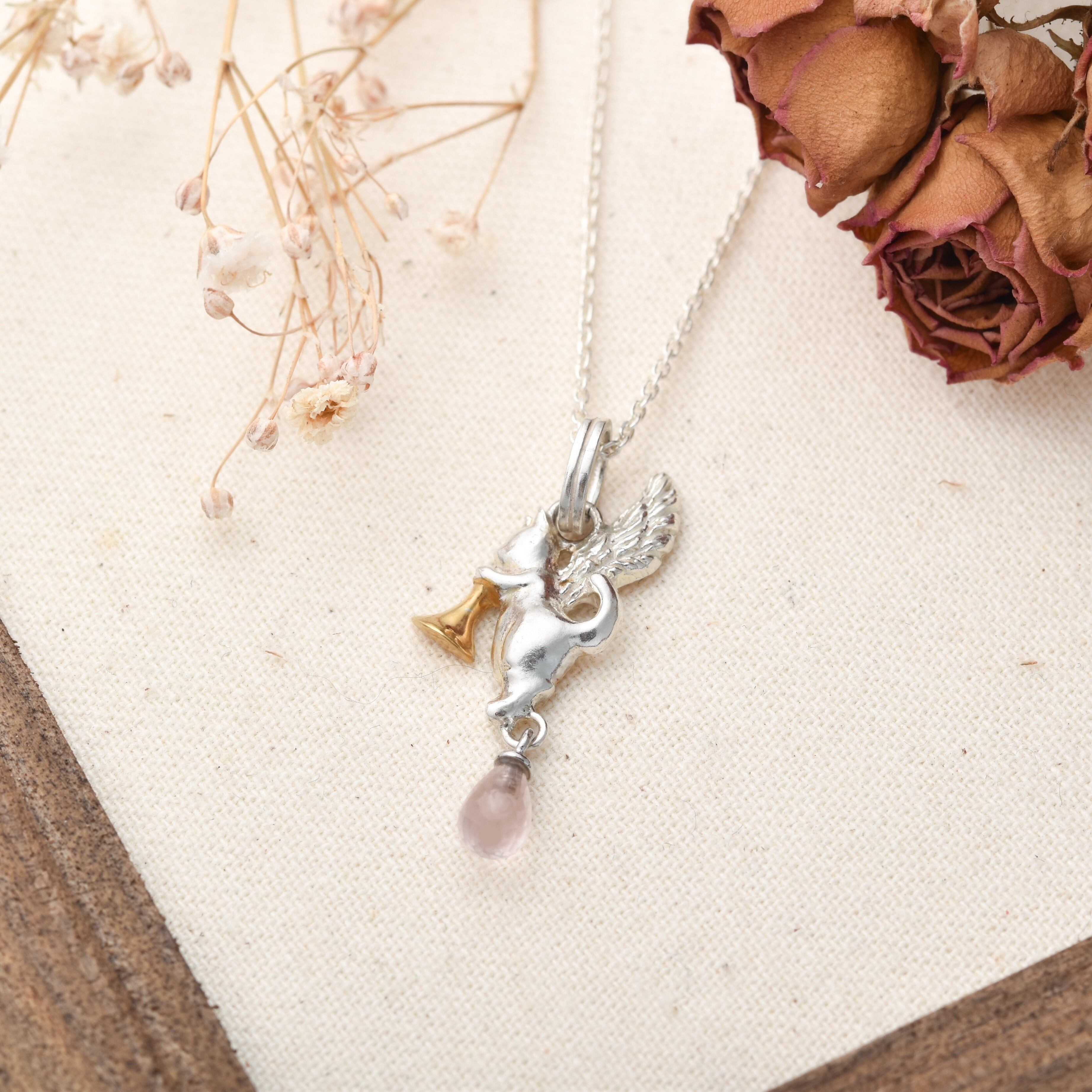 ネコの天使ペンダント ローズクォーツ