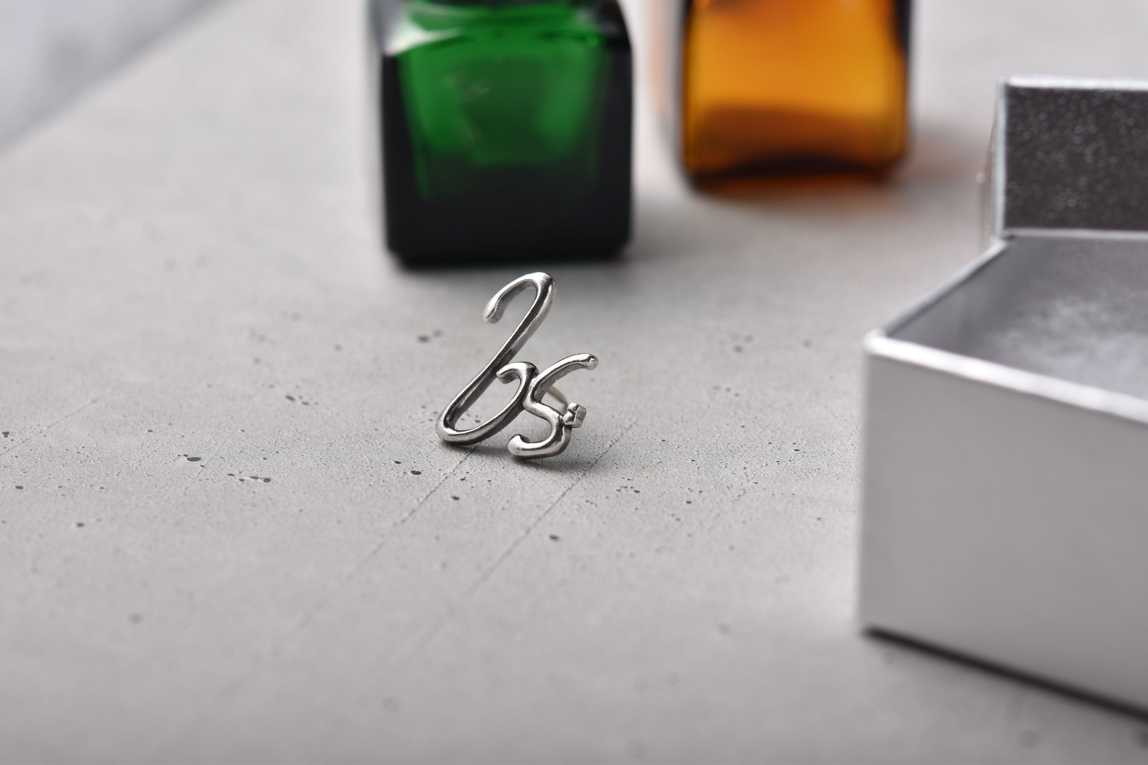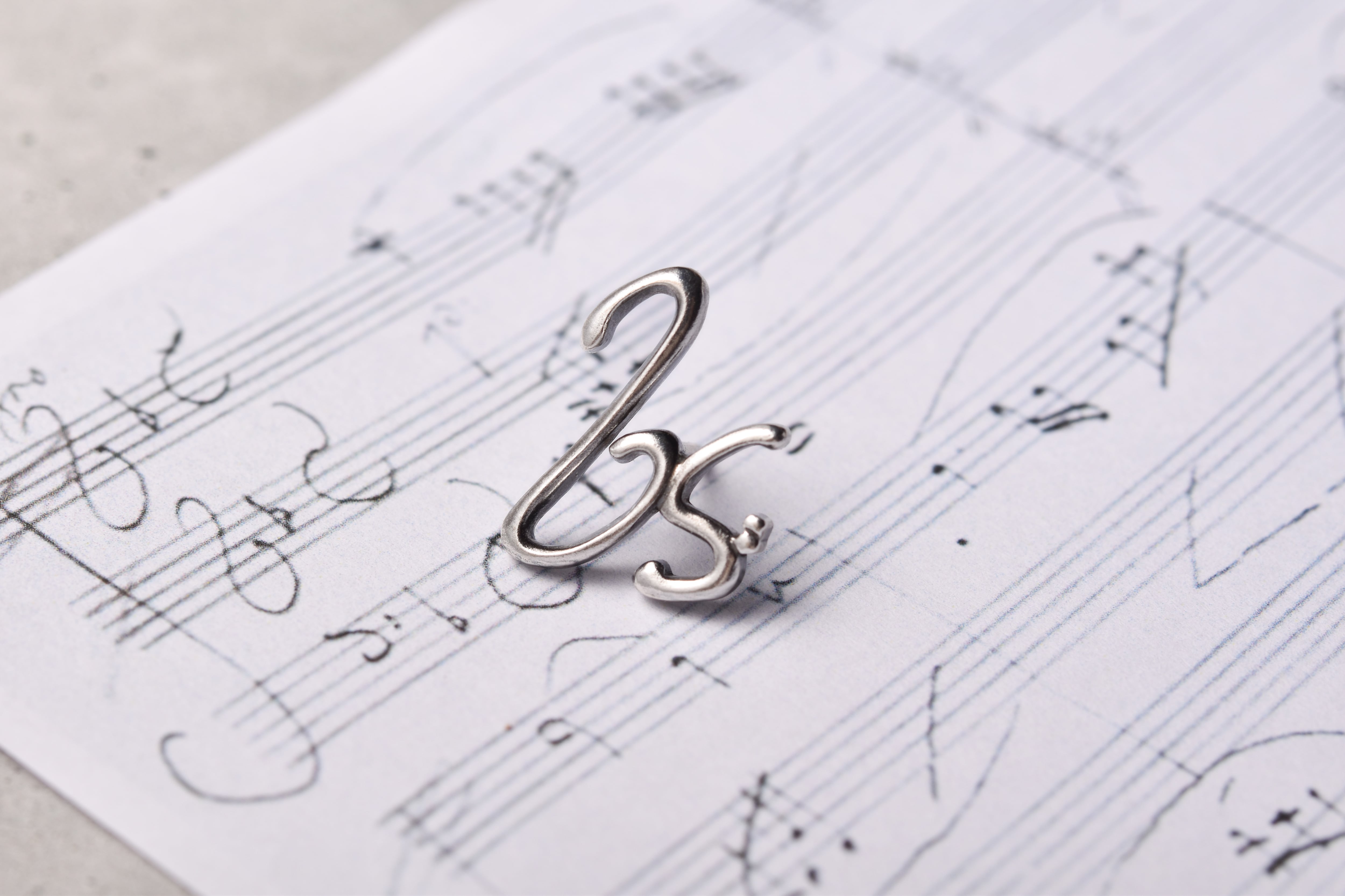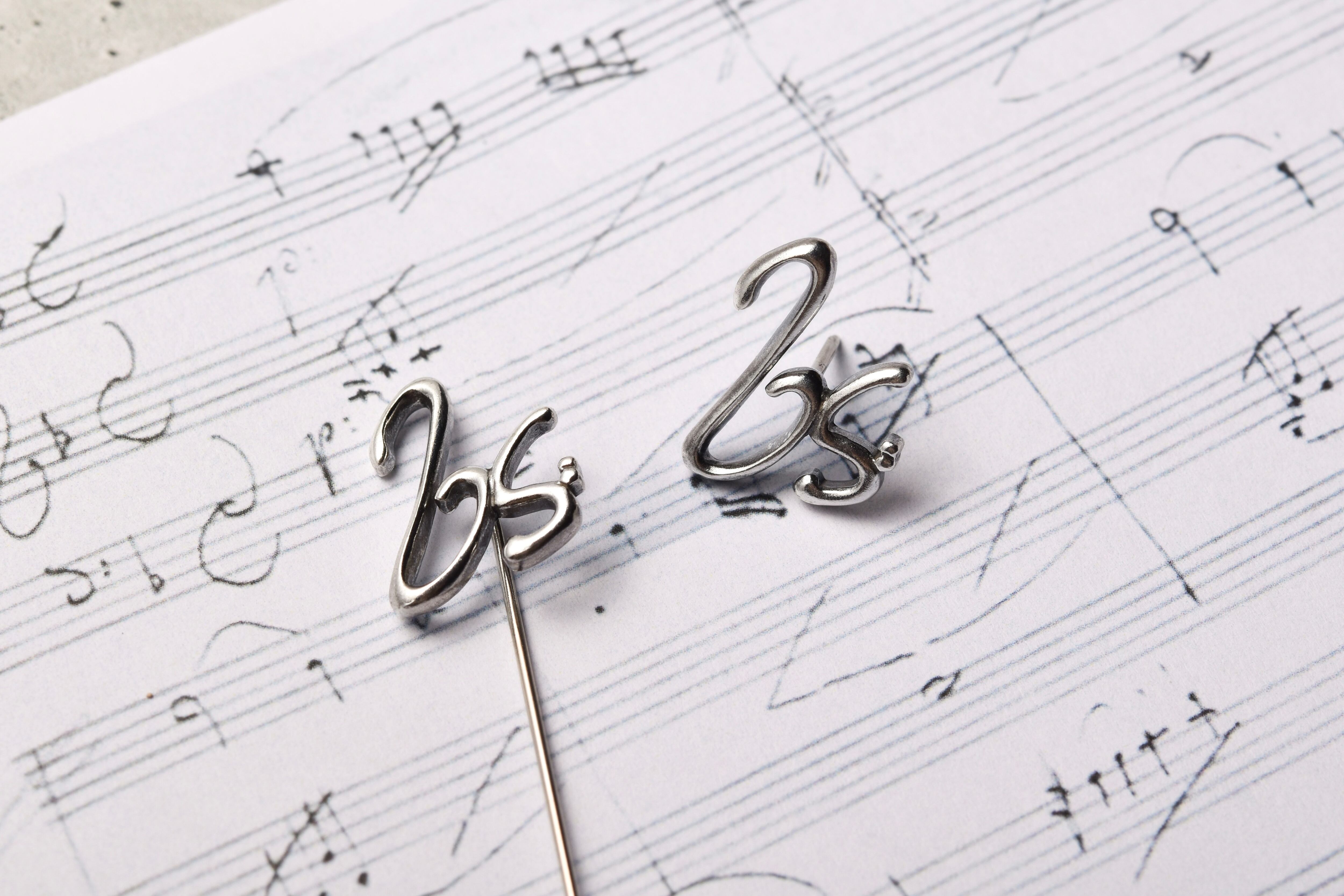 ベートーヴェンの自筆譜から生み出した、ト音記号とヘ音記号のシルバー製のピンバッジです。